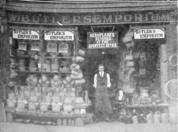 During 1911, a plane travelling from Dover to Shoreham had to land at Bexhill for some emergency repairs. Butler's were quick off the mark in seeing a marketing opportunity and arranged some signage for the shop advertising airplane repair services[1].