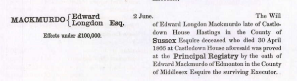In November 1866, the contents (including a number of valuable artworks) were sold at auction upon the instructions of the executor of E. L. Mackmurdo's (who obviously resided there prior to his demise on the 30th of April that year[1]) estate. In addition to the artworks, the contents of the wine-cellar and plant collection were offered[2]. A genealogical search reveals the deceased to be Edward Longdon Mackmurdo, who was born in Walworth, Surrey during 1784. Edward was the child of Ebenezer Mackmurdo and Sarah Stark; the fifth child out of six, three of whom did not live beyond the age of three. Indeed, it would appear that his mother died either during the birth of his sister, Sarah who did not survive either, or soon after in 1787; Edward being three years old at the time. Edward did not marry, nor did he have any children[3]. His executor waa a cousin, also named Edward Mackmurdo, a chemist, of Edmonton in Surrey - the son of his uncle Edward Longdon Mackmurdo (1756-1817), and the estate was valued as up to £100,000[1].