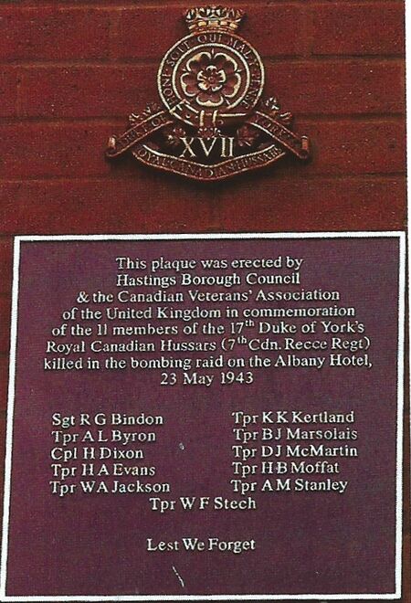 During WW2 on the 23rd of May 1943, the same air-raid that destroyed the Swan Hotel led to the death of 11 Royal Canadian Hussars that had been billeted in the Albany, together with 7 un-named RAF men. A 250kg bomb passed through the Queen's Hotel without exploding, and detonated upon impacting the Albany. A memorial plaque is attached to the wall of block 'C' Albany Court commemorating their service bearing the following inscription: