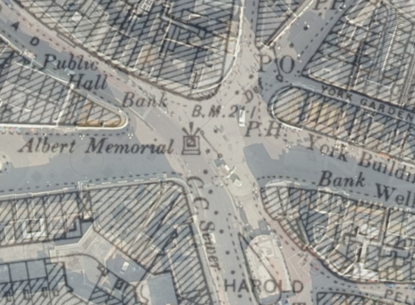 The memorial was slightly damaged after an arson attack on the 28th of April 1973 when the clock sustained damage and the surrounding stone cracked. Then, on Monday June 18 1973 a further smaller fire broke out[3]. Whilst removal of the memorial had been contemplated as early as 1952[6], serious faults found in the structure post-fire resulted in the structure being deemed dangerous and needing demolition. The only parts that survived are the statue of Prince Albert (now erected outside the Town Hall - this having been purchased from the demolition contractors by a Mrs. Skelton and donated to the corporation following storage in a greenhouse in Alexandra Park for decades) and two of the lamps at its base (now outside the Hastings Museum in John's Place) the clock faces, bells and mechanism went into storage but were stolen. The drinking fountain, door and weather vane also went into storage but their current whereabouts are unknown.[7]. The bottle containing the scroll was accidentally broken during demolition and discarded as rubbish; the contractors not having been informed of its presence. Apparently even the museum was unaware of the demolition until it had taken place. Much of the stonework was used for a development in Rock Lane[8].