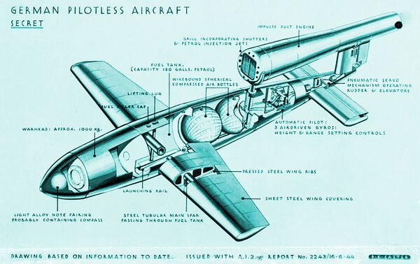 In June 1944, the Germans started sending V1 Flying bombs (or 'Doodlebugs') to target London. A doodlebug was essentialy a bomb with wings, appearing very similar to a small aeroplane albeit with no pilot. In a sense, they could have been called the pre-decessor of the cruise missile. Thousands of these doodlebugs were launched against London.[1]. The missiles were powered by fairly simple pulse-jet engines with a small propellor on the front being used to calculate distance flown by rotating a shaft a set number of turns. When the pre-set number was reached, a mechanism deflected the control surfaces on the bombs causing them to dive onto their targets[2].