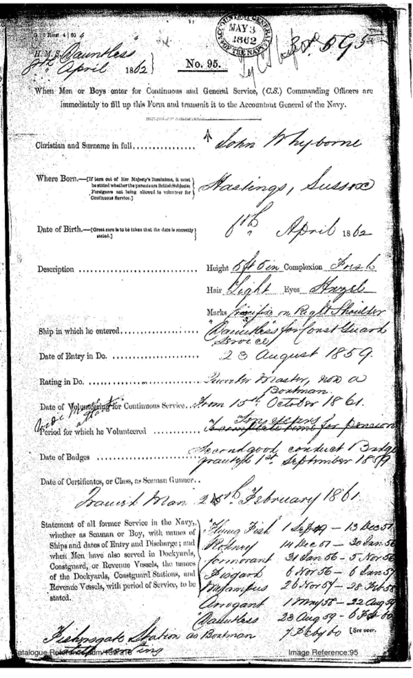 John served in the Crimea campaign aboard HMS Rodney and wrote frequent letters home, many of which were published by Brett in his manuscript histories; most of his published letters cover the time when he was on board HMS Rodney off Sebastopol (see Volume 5 Chapter 52 Pages 124 127 131 & 139, Volume 5 Chapter 54 Pages 226 235 239 et-al.). He is described in his service record as being 5'6" tall with light brown hair and hazel eyes. By 1862 he wore a tattoo of a crucifix on his right shoulder[1]