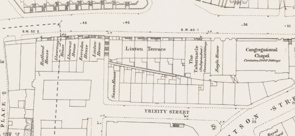 This terrace was absorbed into Cambridge Road circa 1876[1], receiving the name of Linton Terrace in a council meeting held in August 1860; the properties being described as 'All the buildings in Bohemia Road, from the Congregational Chapel to Prospect Terrace'[2]; the Congregational Chapel referred to here being the Robertson Street Congregational Church, and Prospect Terrace comprising the houses the other side of the steps leading to Claremont.