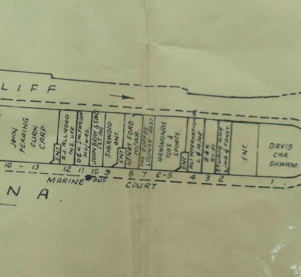 The south elevation is vertical, with balconies imitating the promenade deck aboard the Queen Mary. The upper stories of Marine Court are stepped-in from those beneath, like the superstructure of a ship, those beneath like the immense hull of a liner. The ground floor shop frontages were black; the external walls of Marine Court were painted white.