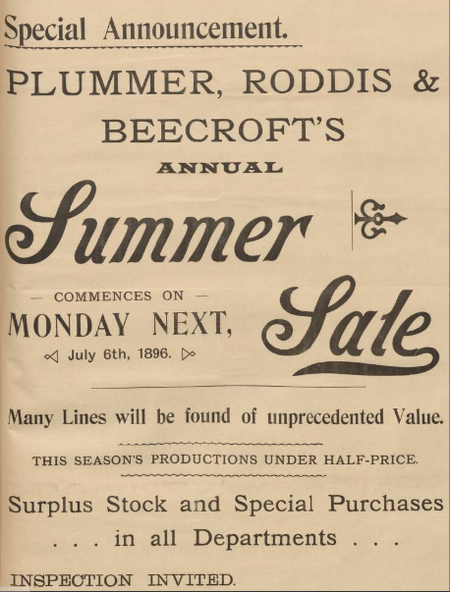In 1887, another partner joined the firm by the name of Beecroft; this partner was not in the business for very long, advertising under the name of Plummer, Roddis and Beecroft disappearing by 1896[2][3].
