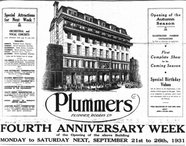 On the fourth anniversary of moving into the new building, Plummer Roddis acquired a front-page feature in the Hastings & St Leonards Observer detailing a week-long series of events including orchestral and choral concerts, a 'jungle' feature on the first floor depicting a fur trapper to feature their range of fur coats, and a number of practical demonstrations of products from the store[8]