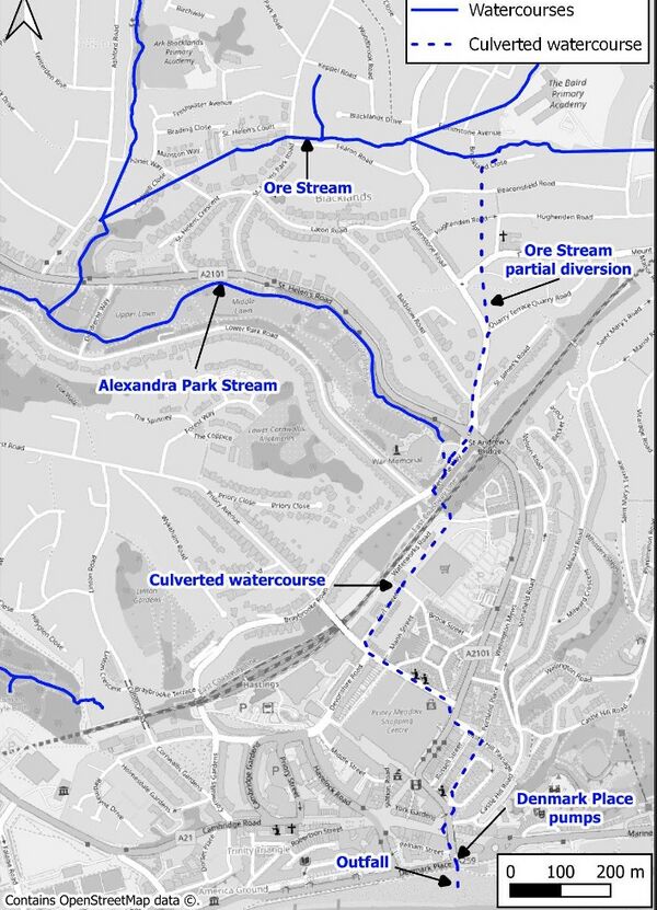 The Priory Stream has two main sources; one being the Old Roar Ghyll waterfalls, the other originating in Ore and snaking its way down the valley towards Beaconsfield Road and merging in Alexandra Park.