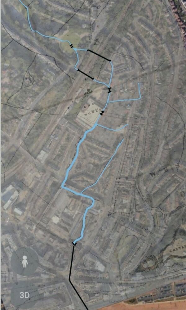 In 1860, there was a complaint of bad smells raised at a Council meeting in which Brett mentions originally 12 air shafts rose from the culverted stream to street level. The odour either arose from the stream, or the Gas Works between Queens Road and the railway lines above St. Andrew's Square (where Morrisons now stands), and was detectable as far away as St. Mary's Terrace. The stream was reportedly in a poor condition and it was proposed that several of these shafts should be closed and property owners adjacent to the culvert be made responsible for clearing their portion of it. Councillor Picknell was noted as believing the odours arose when the gas-works cooled the coke by pouring water over it[7].