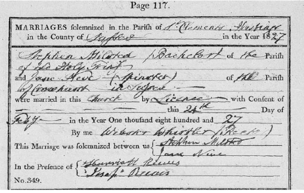 According to Brett, Milsted built the Horse and Groom in 1829, when it was the principal tavern in the new town of St Leonards. Milsted was a plumber, painter and glazier, and was listed as such in the 1832 trade directory, operating at Priory as well as St Leonards. Until 1837 he was in partnership with Charles Neve, whose sister Jane he married at St Clements in 1827. The approximate dates of their various residences can be extrapolated from their births of their children. The first three were born in 1828 and 1831 on the America Ground, the next in 1837 in St Leonards and the last in 1840 and 1843 in Tenterden.[a].